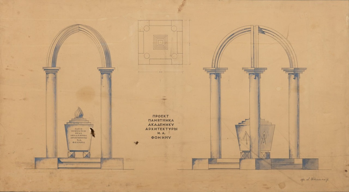 Это проект памятника академику архитектуры И. А. Фомину, выполненный Лидией Твелькмейер для архитектурного конкурса.