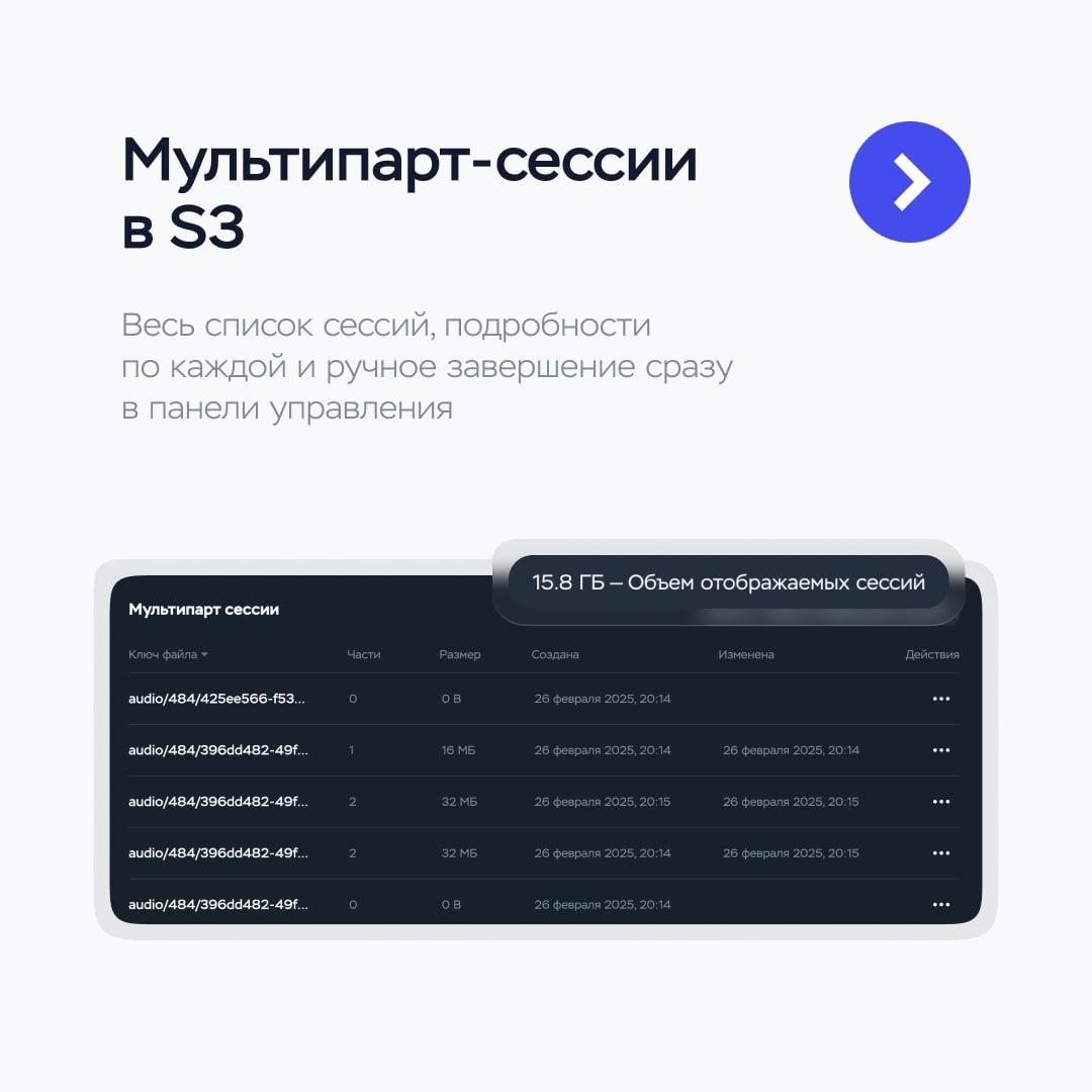 ➖ Возможность вручную завершить любую сессию с очисткой загруженных частей, если аплоад завис или отменился