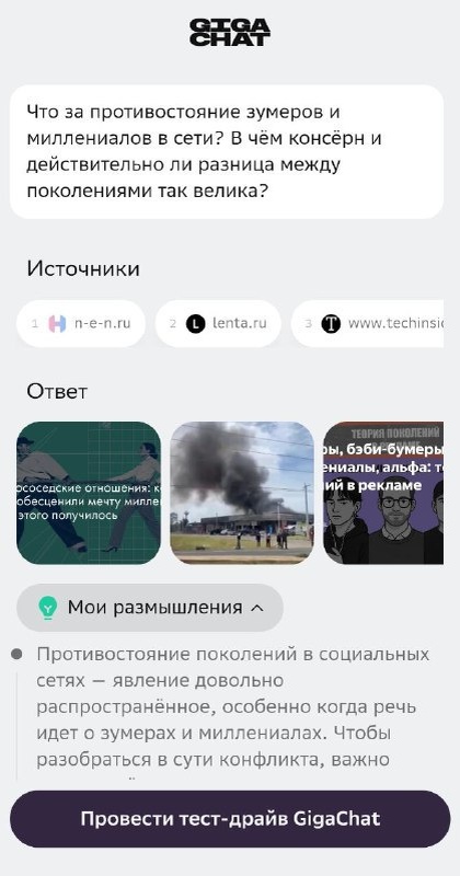 Лол, чел попросил GigaChat разобраться в "бифе между миллениалами и зумерами" через "режим reasoning