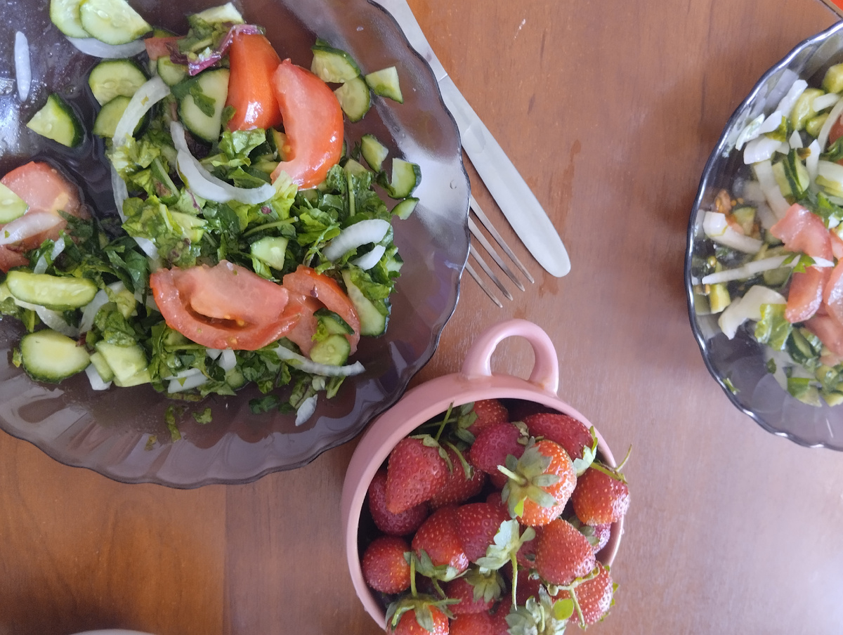 Привет, друзья! ДМ, наш домашний диетолог, все так же продолжает кормить меня и себя, сам готовит, хотя иногда и допускает меня к плите.😁🤭 Это наш перекус. Клубнику покупала на мини- рынке за 300гр отдала 120 рублей. Салат из овощей, которые мне подружка со своей дачи отдала. Это обед. Жара, есть вообще не хочется. Сегодня я решила зайти в соседний магазин "Магнит-Косметик" и купить то, что мне нужно для дома. Только зашла в магазин, мне "случайно" пришел скидочный купон в приложение. Вот как так? Большой брат следит за нами?🤔 В результате я решила взять все что нужно мне, сложить тут в корзину обычную и виртуальную и сформировать заказ "самовывозом", а продавцу останется на кассе только "пропикать" мною же собранные товары и выдать мне мой заказ . Эту схему мне девочки в магазине посоветовали. У меня всё получилось! В результате я вместо 2083,93 рублей заплатила 994, 30 да ещё и бонусы получила дополнительно- 49, 56. Вот мои покупки. Цены со скидками приятно радуют. В