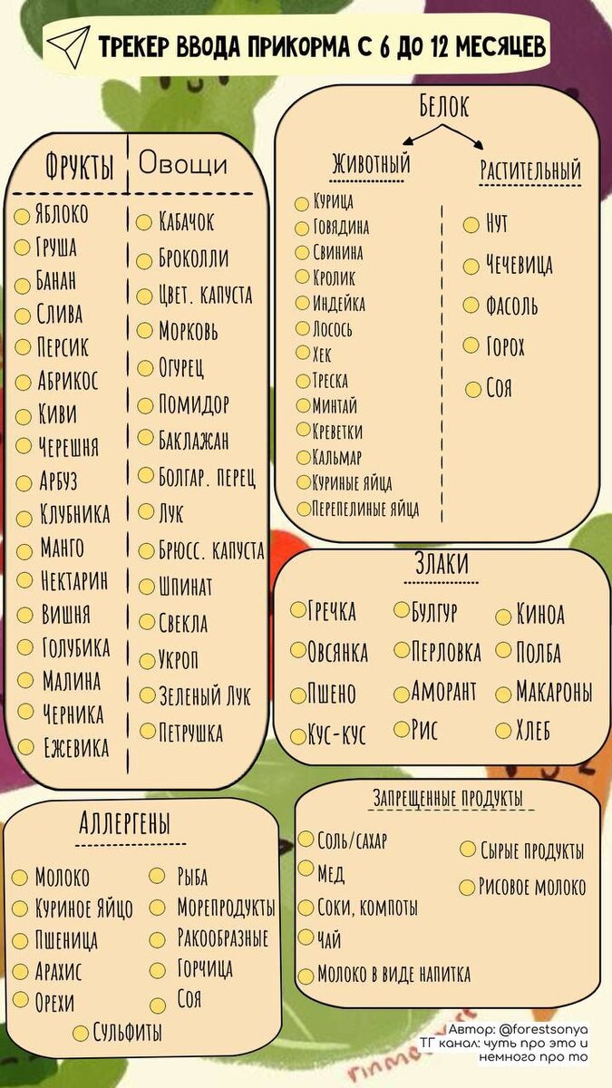 💬Сегодня хочу обсудить важную тему о вводе различных групп продуктов в рацион малыша. На счет этого ведутся многие споры и остаются вопросы даже у тех, кто давно ввел прикорм. Возможно вам это пригодится со вторым малышом, может кто-то только начинает прикорм или просто узнаете, что-то новое для себя. ◀️В прикрепленном трекере конечно же не все продукты, кажется записать прям все практически невозможно. Это просто приблизительный ориентир. Отдельно хочу отметить, что когда я говорю «сначала прикорма» - имеется ввиду начало прикорма согласна всем признаком готовности малыша, обычно около 6 месяцев. Начнем по порядку каждой группы продуктов: 🍎Фрукты и ягоды: Можно все с начала прикорма. И яркие, и красочные- любые. И да, можно даже первыми. Яркие, вкусные, сочные фрукты будут даже подпитывать пищевой интерес, что будет только плюсом, так что то, что с них нельзя начинать прикорм - это миф. 🥒Овощи: можно все с начала прикорма. Однако есть оговорка. В ряде стран не рекомендуют