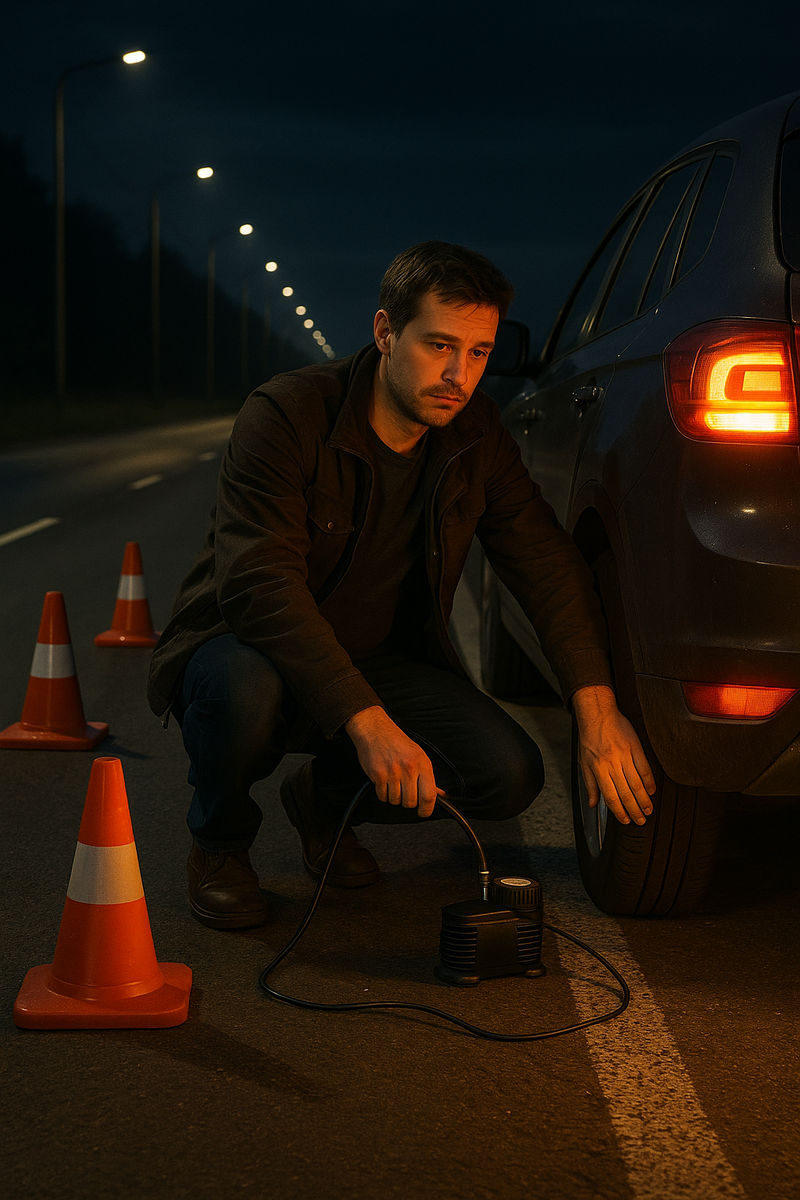 Если у тебя нет компрессора в машине — ты пока просто не встревал по-настоящему. Однажды возвращался ночью с дачи. Всё хорошо, пока машина вдруг не начинает тянуть вбок. Выхожу — колесо спущено. До ближайшей заправки 11 км. Насос — в гараже. Компрессора — нет. Начал звонить друзьям — кто пьёт, кто спит. Один вообще спросил: "Ты на велосипеде?" В итоге, как идиот, ждал эвакуатор полтора часа. Итог — минус 4 тысячи и минус вера в людей. Короче: