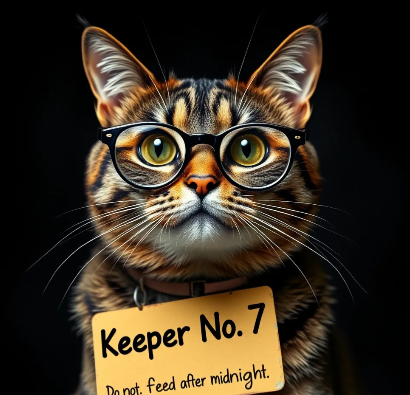 Не просто кот, а кот в очках и с табличкой на шее: **«Хранитель №7. Не кормить после полуночи»**.