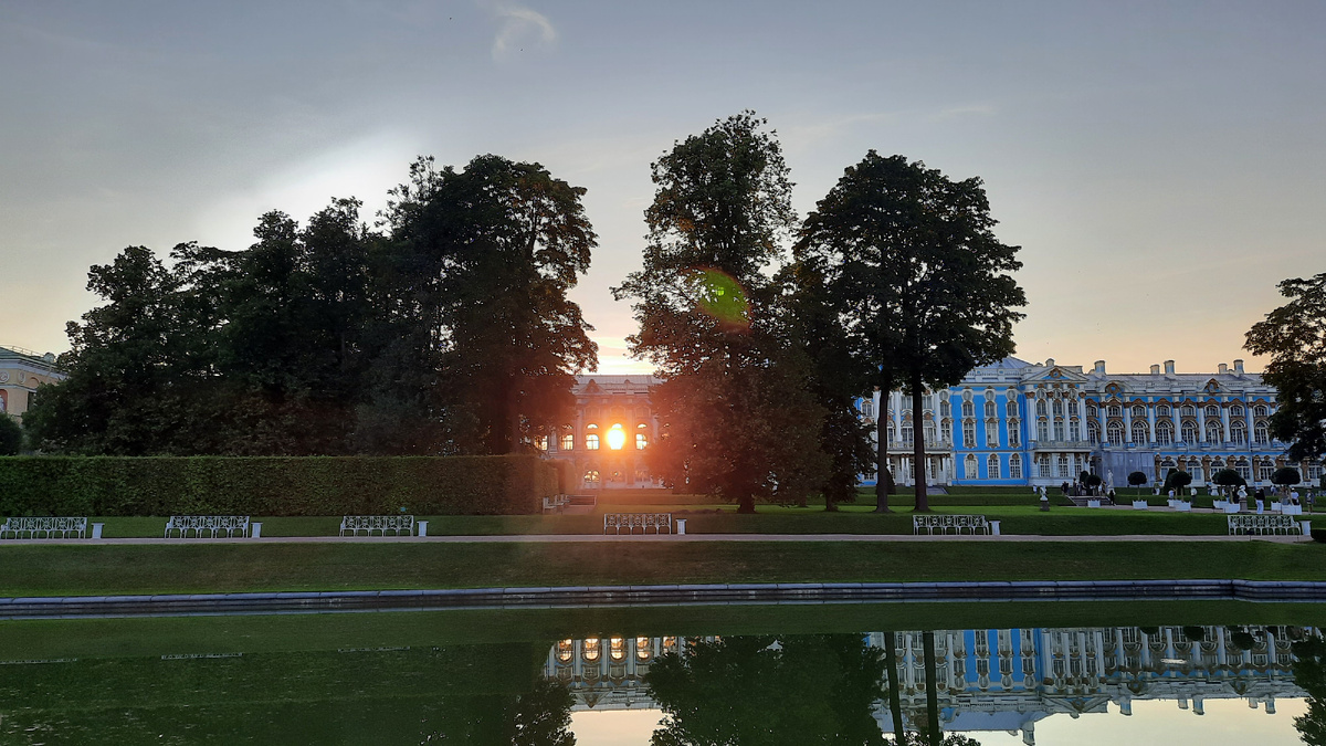 Большой зал Екатерининского дворца, 800 квадратных метров, окна входят на обе стороны - на Парадный плац и в парк. Иногда, когда повезёт, можно увидеть, как солнце на закате прошивает зал насквозь. Редко такое бывает, чего уж там. Малейшая тучка и картинка уже не та. Но вчера был как раз счастливый случай. Если вам понравилось, пожалуйста, воспользуйтесь кнопочкой "Поддержать".