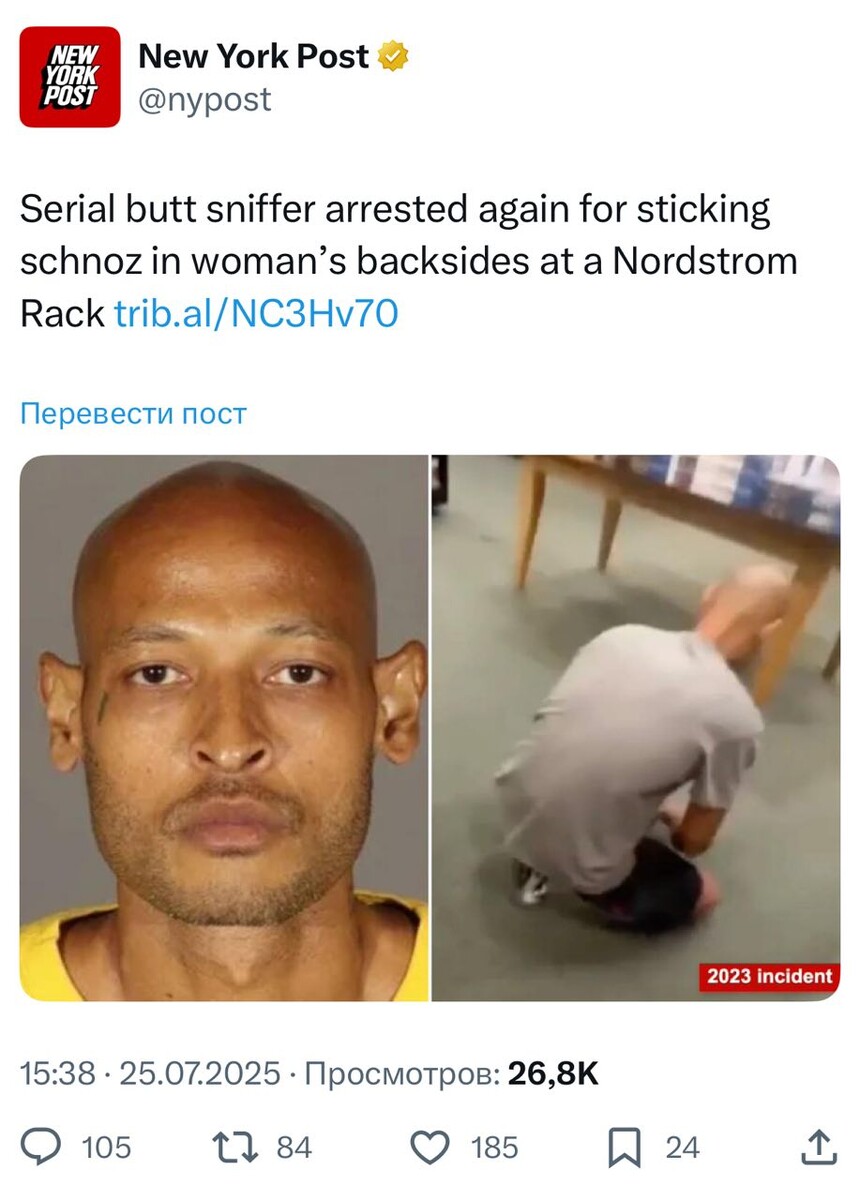 В Калифорнии вновь арестовали серийного нюхателя ягодиц 38-летний мужчина задержан в торговом центре за подкрадывание к женщине и нюханье её ягодиц. У него уже есть прошлые правонарушения, включая вирусное видео в 2023 году. После выхода на свободу он вернулся к своим привычкам и снова будет ожидать суда. ────────── ⚡️Важные новости – без лишнего шума!⚡️ Подпишись на канал и получай только суть: оперативно, чётко, по делу! 👉 ИнфоСплетник | @infospletnik