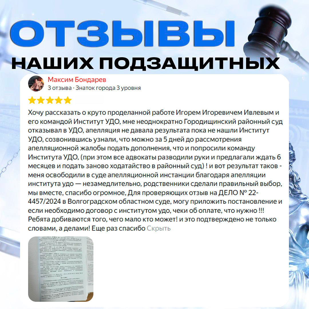 К сожалению, часто сталкиваемся с тем, что до нас у человека был негативный опыт: – Адвокаты отказывались от дела – Брались, но не понимали, что делать – Или, что хуже всего, давали гарантии и проигрывали Очень сложно потом заново выстраивать доверие и объяснять, как на самом деле работае, и что действительно влияет на решение суда 📍 В этом деле человек был осуждён по ч. 3 ст. 30, п. «г» ч. 4 ст. 228.1 УК РФ 📍 Ему неоднократно отказывали в УДО ссылались на то, что преступление относится к особо тяжким, а примерное поведение «не показатель». Суды считали, что освобождение не соответствует целям наказания. Человек обратился к нам вовремя, как можно прочитать из отзыва! Спасибо огромное за доверие, было очень приятно иметь дело 🤝 ✅ Апелляция отменила отказ и указала, что: – Вывод суда первой инстанции противоречит материалам дела – Суд формально подошёл к вопросу, не изучил личность осуждённого – Отказ в УДО был необоснованным 📌 Отменил отказ и вынес новое решение! Ходатайство удовлет