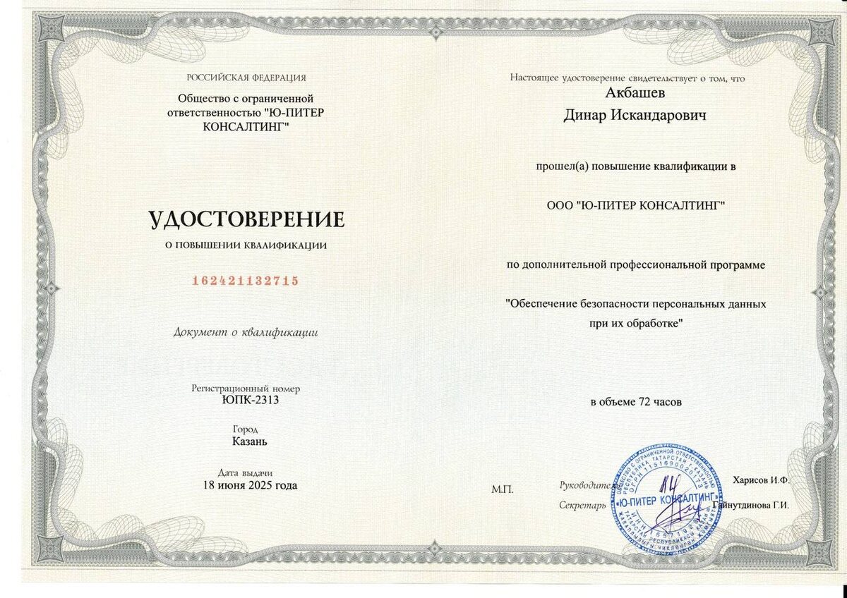 ✨ Обучение завершено: новый уровень защиты ваших данных! ✨ Друзья, у нас отличные новости! Недавно наш директор Динар Акбашев завершил курс повышения квалификации по обеспечению безопасности персональных данных в соответствии с актуальным законодательством. Теперь он обладает всеми необходимыми знаниями и навыками для надёжной защиты вашей информации! В мире, где данные — это новая валюта, их безопасность имеет первостепенное значение, он получил соответствующее удостоверение, подтверждающее его компетентность в этой области. Это гарантия того, что ваши данные находятся под надёжной защитой. Наша цель — чтобы вы чувствовали себя уверенно, доверяя нам свои данные. Стремление к профессиональному росту и совершенствованию позволяет нам предоставлять услуги на высшем уровне. Теперь ваша информация в самых надёжных руках! 📜 Ссылка на законодательство РФ о защите персональных данных: Закон "О персональных данных" № 152-ФЗ Спасибо за ваше доверие и поддержку! Вместе мы сделаем проц