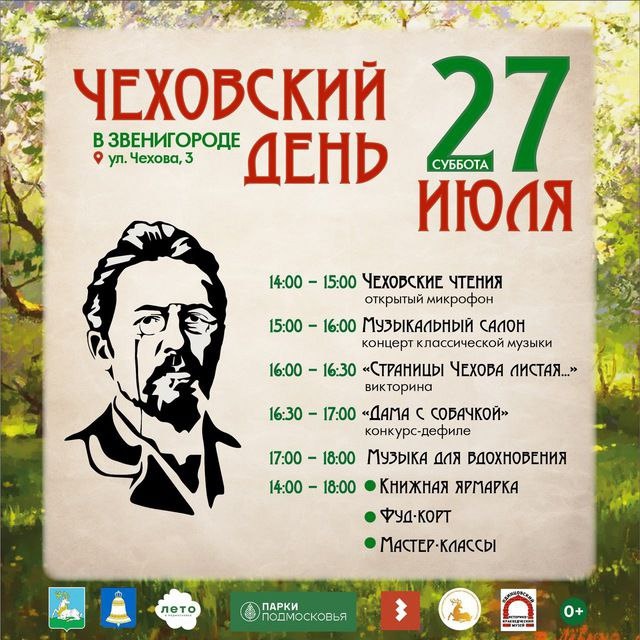 Завтра 26 июля книжный магазин-клуб Ч|Б принимает участие в ежегодном фестивале "Чеховский день", посвященном первому приезду Антона Павловича Чехова в славный город Звенигород, тогда уездный. "Чеховский день" в Звенигороде: погружаемся в мир великого писателя! 27 июля городском парке Звенигорода состоится яркое событие, посвященное великому русскому писателю Антону Павловичу Чехову – "Чеховский день в Звенигороде". Гостей ждет насыщенная программа. В 14:00 приглашаем на открытый микрофон «Чеховские чтения», где каждый сможет прочесть любимый отрывок из произведений Антона Павловича или поделиться своими впечатлениями о его творчестве. В 15:00 Московский государственный академический театр балета «Русский балет» представит балетную историю, которая обязательно тронет ваши сердца! В 15:30 знатоки творчества Антона Чехова смогут принять участие в викторине «Страницы Чехова листая…» и проверить свои знания о жизни и творчестве писателя. В 16:00 приглашаем вас в Музыкальный сало