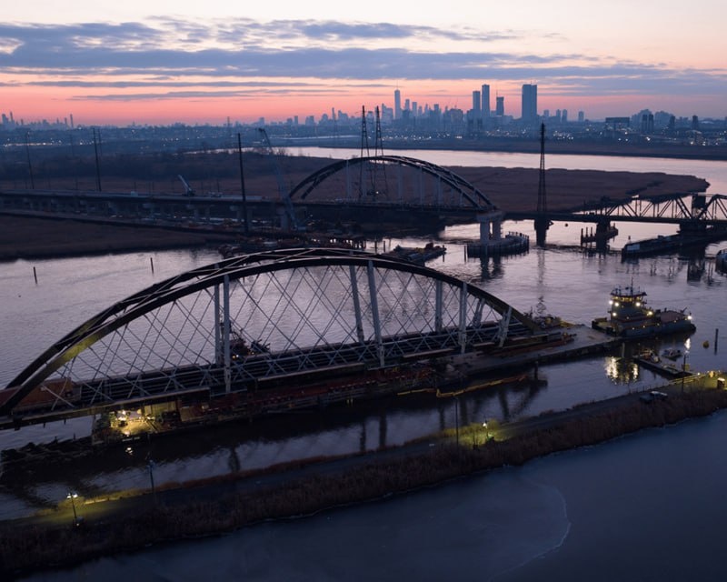 Продолжаем следить за интересными проектами по всему миру: компания Mammoet завершила сложнейшую операцию по установке пролётов моста Portal North Bridge в Нью-Йорке Строительство нового моста Portal North Bridge – ключевой этап модернизации Северо-Восточного железнодорожного коридора (NEC) США. Эта линия считается самой загруженной в Западном полушарии: ежедневно она обслуживает до 200 000 пассажиров, а интервал движения поездов составляет около 2 минут. Новый мост заменит устаревший разводной мост Portal Bridge, построенный в 1910 году, который часто называют «Ахиллесовой пятой» всей линии: скорость движения по старому мосту ограничена до 60 миль в час, а неисправность разводного механизма – причина частых задержек поездов. Строящийся мост будет неразводным, его подмостовой габарит – 15 метров, что в два раза больше, чем у старого моста. В работах по транспортировке и установке конструкций моста участвовали компании Skanska, Traylor, Carver Marine и Mammoet. Специалисты Mammoet