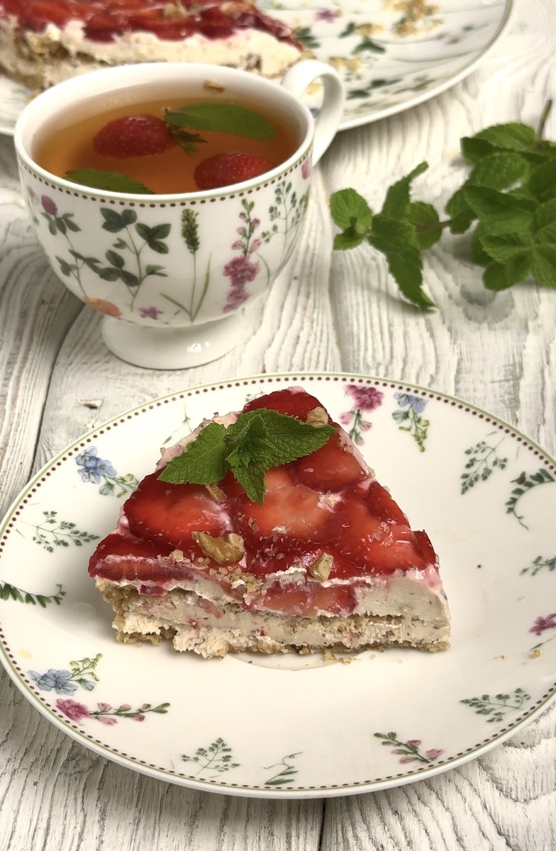 Новая реальность десертов. По данным современных трендов, в 2025 году наблюдается явное смещение: меньше добавленного сахара, меньше ультра-процессированных продуктов, больше белка, натуральный состав и фокус на здоровье. Одним из ключевых трендов становится использование фиников как натуральной сладости, а не белого сахара - они становятся всё более популярны в десертах, энергетических батончиках и домашней выпечке. Согласно экспертам, 65–70 % потребителей стремятся к снижению потребления белого сахара, при этом предпочитая натуральную сладость - от фруктов, ягод, сухофруктов. Вкус лета. Можете экспериментировать с ягодами/фруктами вместо клубники. Например, взять малину, персики или нектарины. 120 г грецких орехов 200 г творога (брикет) 100 г мягкого творога 50 г фиников уже без косточек 100 г клубники Грецкие орехи измельчить в процессоре блендера. Два вида творога пробить погружным блендером с финиками. Кольцо 16 см застелить пищевой пленкой, выложить нарезанную клубнику. Свер
