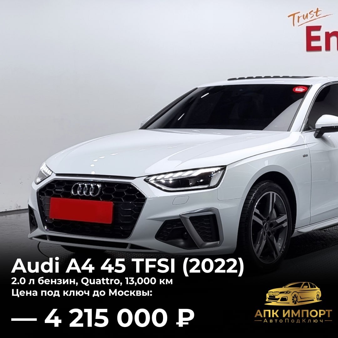 🚘 Audi A4 45 TFSI (Quattro, Premium) 📍 Основные характеристики: 🔹 Год выпуска: 06/2022 🔹 Пробег: 13,000 км 🔹 Двигатель: 2.0 л бензин, полный (Quattro) 🔥 Двигатель 45 TFSI разгоняет A4 до 100 км/ч всего за 5.8 секунд — быстрее, чем многие «заряженные» хэтчбеки. ➡️ Комплектация Premium включает: полностью цифровую панель Audi Virtual Cockpit, мультимедиа MMI с сенсорным экраном, адаптивный круиз-контроль, систему удержания в полосе, камеры кругового обзора, спортивные сиденья с электроприводом и памятью. 💰 Цена: 4,215,000 рублей под ключ с доставкой до Москвы и полным комплектом документов! ⬇️ Больше фотографий в комментариях 🔗 Ссылка на объявление 🚗 Пишите в личные сообщения для консультации и заказа! 🇰🇷#изКореи #апкимпорт #Audi