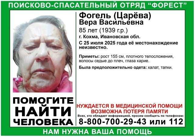 🆘Поисковый отряд «Форест» ищет Фогель Веру Васильевну 85-летняя женщина пропала 25 июля в Кохме. Была одета в халат и тапочки. Нуждается в медицинской помощи. Инфорг: Екатерина 8-910-999-31-19, 8-800-700-29-43