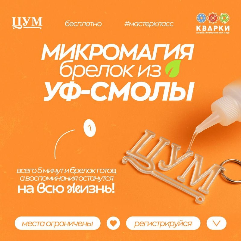 🧬МИКРОМАГИЯ: брелок из УФ-смолы🎁 Уникальные предметы, в которых можно запечатлеть момент с помощью светоотверждающей смолы — всего 5 минут и брелок готов, а воспоминания останутся на всю жизнь 💕 Вместе с музеем «Кварки» мы подготовили для вас занимательный мастер-класс! Участники разложат свои украшения в специальной форме так, как им нравится. Затем, залив УФ-смолу, они поместят брелок под ультрафиолетовую лампу на пять минут. И вот ваше творение готово! Теперь вы можете удивить им близких, родных и друзей. ❗️ВАЖНО: это детский мастер-класс, регистрировать можно только ребёнка. Родители могут помогать деткам. 🔗 Регистрация на мастер-класс ⏰ 13:00 и 13:30 🗓 26 июля 📌ЦУМ, 5-й этаж, сцена