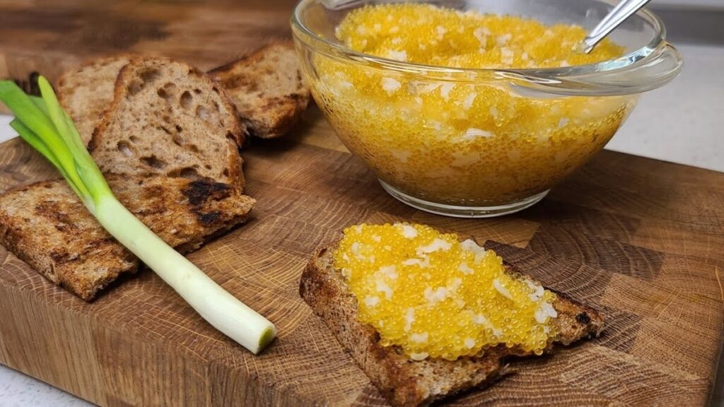 - Выложить закуску в прозрачную икорницу и украсить сверху колечками лука.