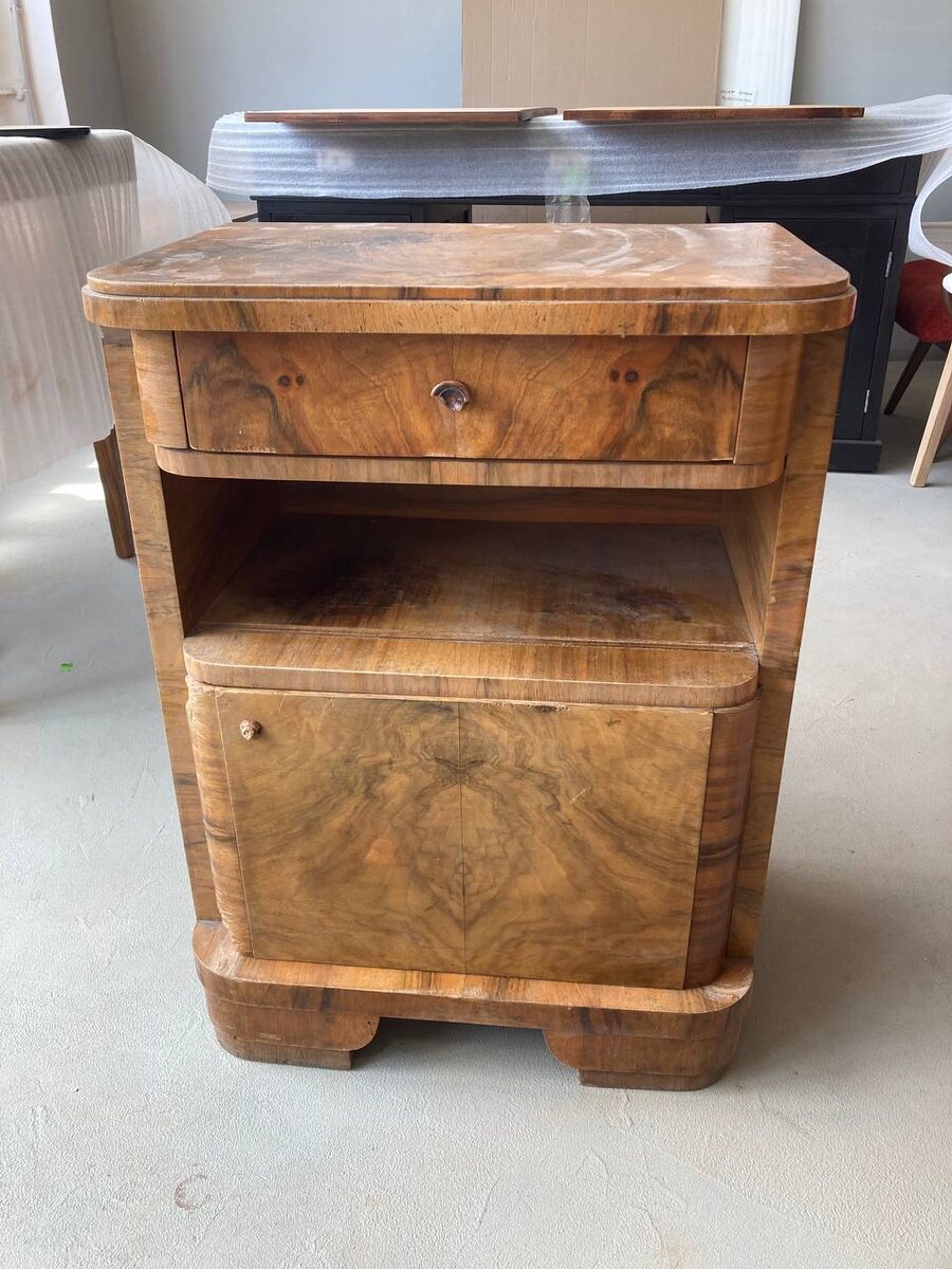 Эта очаровательная тумбочка - экземпляр 1930х годов. Небольшой, но очень эффектный предмет! Приехал он от нашего постоянного заказчика из Москвы. Эта вещь из семьи и для владельца – предмет ценный и важный. Но тумбочка живет уже давно и за время её долгой жизни, тумбочка пострадала от большой любви к ней домашнего питомца. Собака погрызла дверцу и угол тумбы, также была утрачена ручка и частично шпон. Но здесь сохранились оригинальные стекла. ✨Мы полностью разобрали предмет в мастерской, сняли с него старое покрытие, восстановили все утраты, восполнили съеденные части и утерянные, собрали тумбу и затонировали все восстановленные детали в тон оригинальных. Покрыли маслом с воском этот роскошный шпон – он стал снова ярким и сияющим! Тумба уехала к заказчику с нашим водителем. Спасибо, что доверяете нам и спасибо, и что остаётесь с нами надолго! Мы рады восстанавливать для вас прекрасную мебель с историей! ✨Если у вас есть предмет или вы пока в поиске идеального, но хотите понять сколь