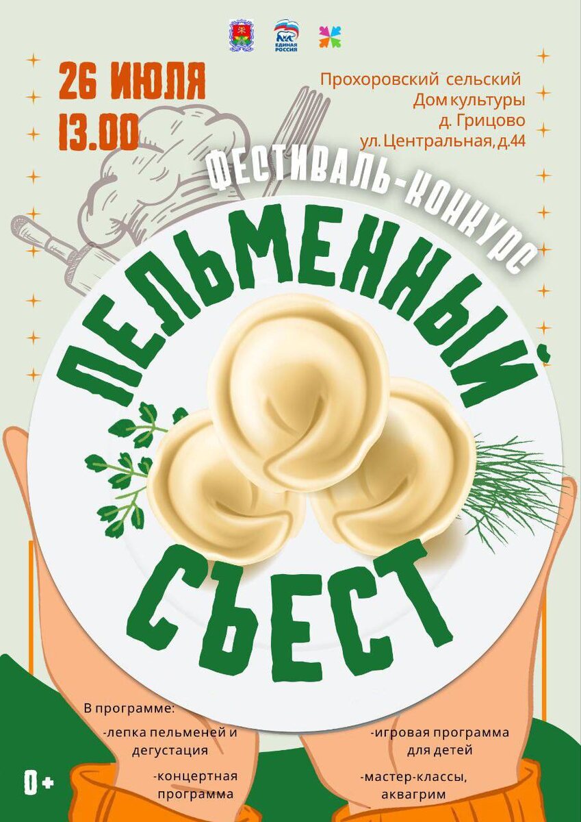 🎉✅В Новомосковске пройдёт гастрофестиваль «Пельменный съест» «Пельменей много не бывает» — решили в Новомосковске и запланировали на 26 июля проведение фестиваля-конкурса «Пельменный съест». Фестиваль, ставший уже традиционным, пройдёт в деревне Грицово Новомосковского района на площадке у Прохоровского сельского Дома культуры. В программе: лепка пельменей и дегустация, концертная программа, мастер-классы и игровая программа для детей, аквагрим. Начало в 13.00 0+