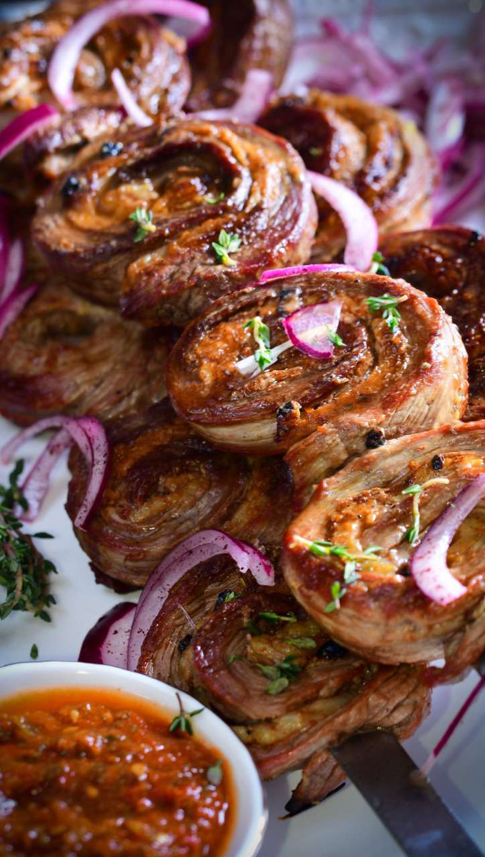 - Тайная скрутка: Теперь самое интересное. Аккуратно, но плотно сверните мясо с жиром в рулет, по всей его длине. Чем плотнее свернете, тем лучше потом держаться будет.