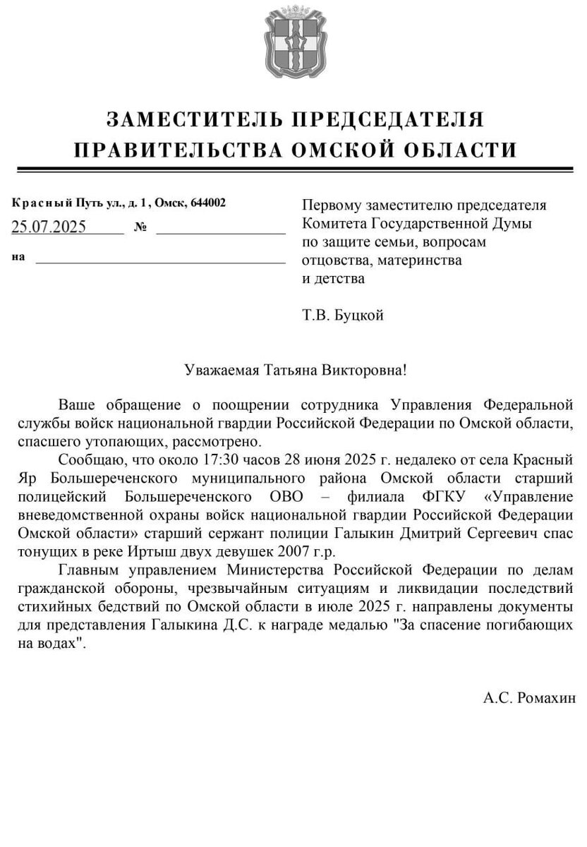🏅Полицейского, который спас тонущих девушек, представят к медали! 28 июня в СМИ появились новости о том, что недалеко от села Красный Яр Омской области старший сержант Росгвардии Дмитрий Галыгин спас тонущих в реке Иртыш двух девушек 2007 года рождения. Сообщалось, что отдыхая вместе с семьей на берегу, сержант услышал крики о помощи, а затем увидел, что в реке тонут две девочки. Дмитрий прыгнул в воду и спас подростков. Одна из девочек уже потеряла силы и уходила под воду. 📨 Тогда я написала обращение на имя главы Омской области Виталия Хоценко с просьбой отметить смелые и самоотверженные действия старшего сержанта Росгвардии. 📩 И вот мне пришел ответ! Из него следует, что главным управлением МЧС по Омской области направлены документы для представления Дмитрия Галыгина к награде медалью «За спасение погибающих на водах». #Депутат_Буцкая