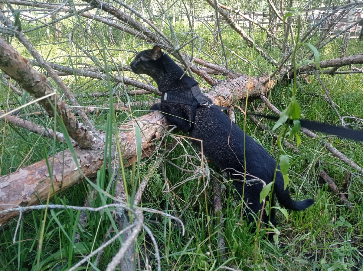 Для Лимона же шлейка, наоборот, стала билетом в большой мир, практически на волю (но да, контролируемую). И хотя кошки по большей части отрицательно относятся к какой-либо амуниции, ограничивающей их свободу перемещения (наши, например, выразительно прижимают уши даже тогда, когда мы просто надеваем на них противоклещевые ошейники), а уж дикие и подавно, наш чаузи не только легко и быстро принял шлейку, но и, кажется, полюбил ее – как символ прогулки. Хотя походка у него, когда он облачен в свое снаряжение, весьма специфичная.