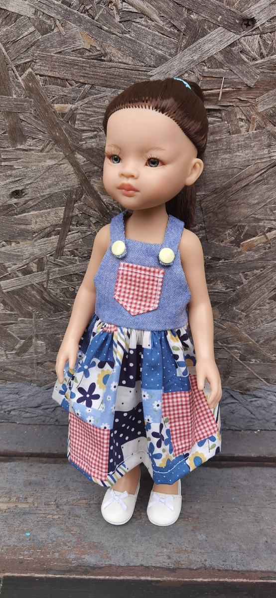 На следующий, после волхования Иришки и Маришки на даче, день, стало значительно теплее, выглянуло солнце. Все обрадовались: можно отложить кусачие свитера и снова нарядиться в летние платья! И заказать новый сарафан, какого ни у кого из кукол нет! Идея мне понравилась, и я за вечер сшила сарафан на паолку, комбинируя два вида ткани - однотонную и в стиле "Пэчворк". Скомбинировала еще и два вида выкроек. Верх для сарафана я взяла от комбинезона, а юбку из двух деталей - от платья. Да, сарафан мне заказала Мали (Паола Рейна). Получился вполне себе симпатичный "кантри стайл", с кнопками на лямках и функциональным кармашком спереди. И вот приезжаем мы на дачу... -Вот не поняла я ничего! А где солнце? Одни тучки! И даже что-то капает!!! -Ну... пока еще ничего не капает, но солнца действительно нет... Что делать? Откорректировать костюм согласно погоде! -Чего? -Кроксы вместо босоножек, и зонтик! Переобувайся! -И кофточку надень, от ветра! -Я этим баболькам вечером на полке устрою! Солнце о