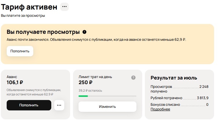 В общем, опыт с Авито просмотры я решил прервать, т. к. тратить деньги стало жалко. Сильно задел пример с товаром, где комиссия (допустим 11%) при цене товара 2590 руб. была бы 284,9р. Однако оказывается, что за 7 дней Авито списал за просмотры по одному этому объявлению 198,40 руб. Плюс еще комиссия за доставку 1,2% (даже если вы платите за просмотры там есть комиссия) еще 31 руб. Всего же, за 19 дней, Авито за 2248 просмотров сняли с меня 3814,9 руб., т.е. средняя цена просмотра была 1,7р. За это время у меня было всего 4 заказа, примерно на 8000 руб, за Авито доставку которых взяли еще комиссию 147 руб. И да это не 1,2%, на последний заказ сделали комиссию 3,2%. При старых условиях, без тарифа «Оплата за просмотры», комиссия была бы 8,5%, и в деньгах это 680 руб. Подведем разницу по тому сколько берет Авито: