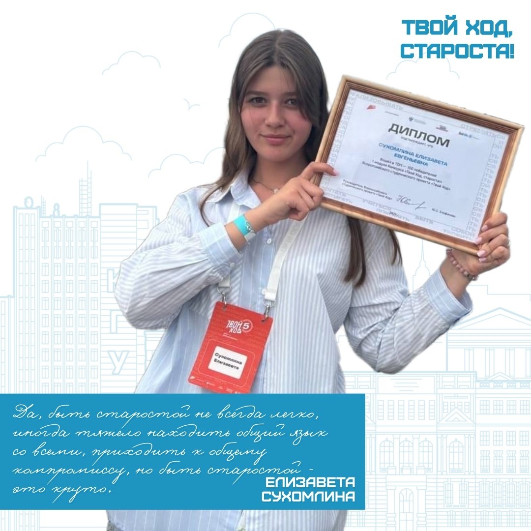Твой ход, староста!💫 Сегодня знакомимся со студенткой колледжа КГУ Елизаветой Сухомлиной. Девушка не только стала победителем, но и вошла в топ-100 лучших старост России. Чтобы принять участие во втором модуле конкурса - обращайся к Юлии Реутовой! ❤️ КГУ | Подписаться