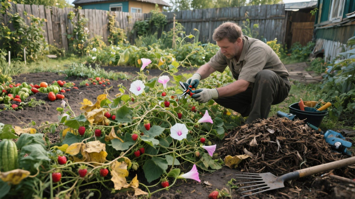 Вьюнок полевой, или как его в народе часто называют — берёзка, выглядит безобидно: тонкие стебли, нежные бело-розовые цветочки, живописно вьющиеся по забору или стеблям культурных растений. Но за внешней «прелестью» скрывается один из самых опасных сорняков, с которым бороться особенно трудно. Он быстро захватывает территорию, душит посадки, мешает росту овощей и ягод, и если упустить момент — может буквально удушить грядку за неделю. Почему берёзка так опасна? Что не работает против вьюнка? Как эффективно бороться с вьюнком? 📌 1. Регулярное истощение зелёной массы