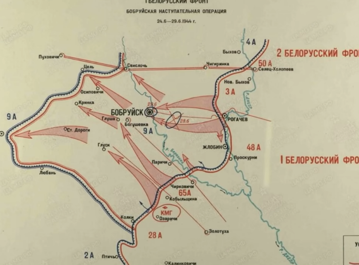 Фронт Рокоссовского наносил здесь два мощных удара, которые сходились севернее Бобруйска, беря его в клещи.