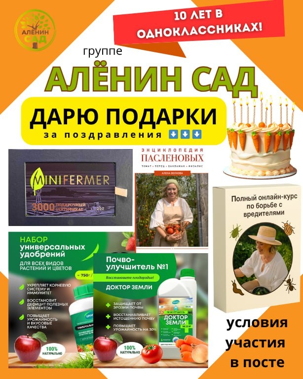 В день рождения дарят подарки! Не упустите свой шанс! 🎁🎁🎁 Группе "Алёнин сад" на ОК исполняется 10 лет! И это повод подарить подарки. Только дарить будете не вы, а я - за лучшее поздравление для юбилея❤️ Пишите их в комментариях к этому посту Я выберу 4 лучших поздравления, авторы которых получат один из подарков: 🎁Сертификат на 3000 рублей от компании Минифермер (Minifermer)/ Сертификатом можно оплатить покупки на их сайте: фитолампы, товары для содержания животных и т.д. 🎁Набор универсальных удобрений для всех видов растений и почвоулучшитель "Доктор земли" от компании Цимус, которая производит натуральные удобрения на основе биогумуса. 🎁 Полный доступ к моему новому онлайн-курсу по борьбе с вредителями 🎁 Мою книгу "Энциклопедия пасленовых: томат, перец, баклажан, физалис" Рассылка призов за мой счет. Объявление победителей будет 1го августа в группе. Время проведения: 25/07-1/08/2025 до 17:00 мск.