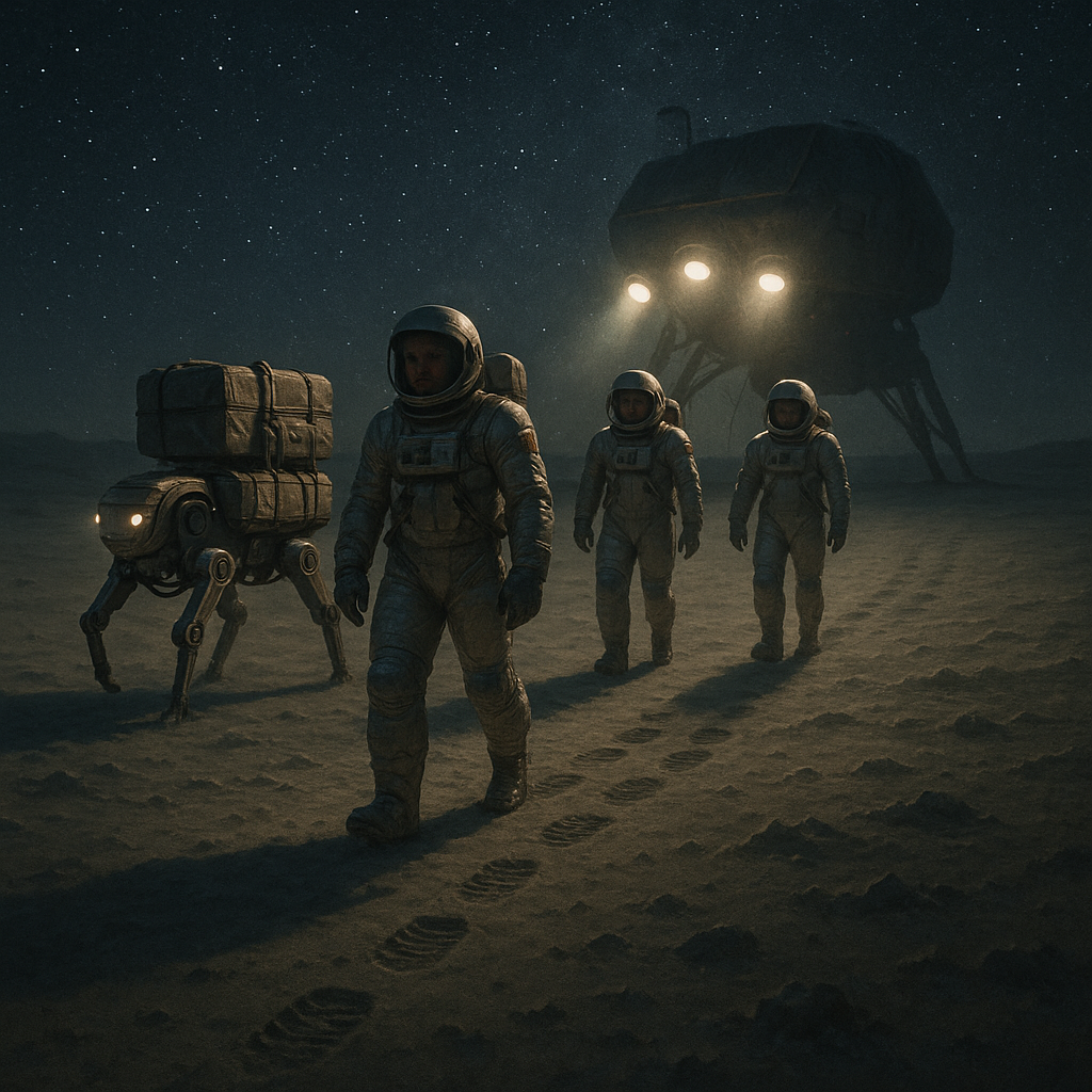 Серо-коричневый пустынный ландшафт навевал тоскливые мысли о предстоящем таком же однообразном ужине. Трое астронавтов, облачённых в громоздкие серебряные скафандры, неторопливо возвращались к кораблю по освещённой панорамными прожекторами равнине. Впереди процессии бодро перебирал лапами робопаук, навьюченный ёмкостями с пробами пород и инструментами. Грунт под ногами послушно и молчаливо проседал под тяжёлыми ботинками. Там, где отсутствует атмосфера, нет и никаких звуков. Четыре вереницы следов за спиной останутся нетронутыми до скончания веков.