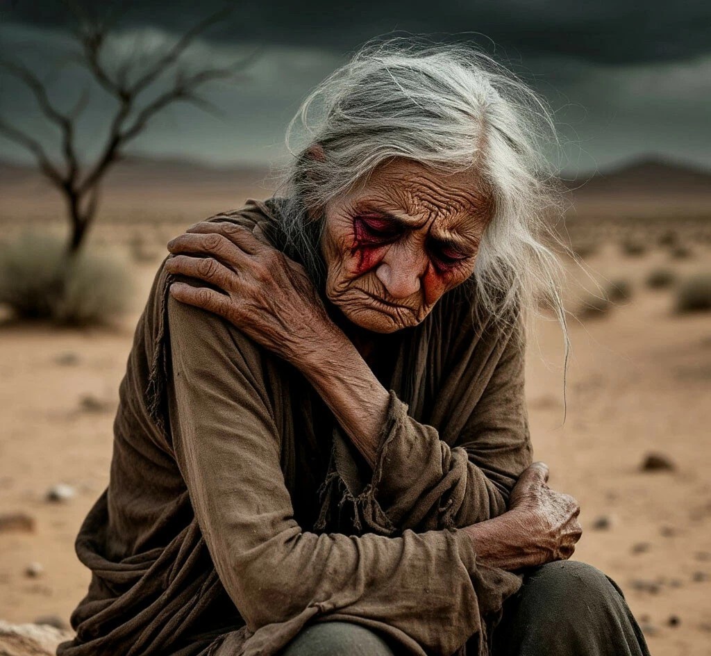 Она сидела сгорбившись, обнимая себя за плечи. Ей было холодно и больно, одна в пустыне, где нет людей, животных, птиц, деревьев, пустота... Она смотрела в темноту, которая не давала ей покоя, она хотела умереть, забыть, исчезнуть, провалиться сквозь землю. Одна...Она осталась одна, оплакивая всех, её глаза, налитые кровью смотрели в пустоту, был слышен скрежет её зубов, её худое тело было покрыто глубокими морщинами, на ней были рваные одежды, седые волосы развивались от ветра. Она звала его то громко, то тихо, слёзы катились из её глаз, губы дрожали и остались только боль и печаль от которых она не могла избавиться. Она потеряла всех, её сердце разрывалось на части, это была невыносимая боль, утрата, она не могла дышать, она рывками глотала воздух, кашляла, почти задыхалась. Воспоминания терзали её, она хотела бы всё изменить, но было уже поздно, она хотела сказать "люблю", но некому было говорить эти слова, она хотела сказать " прости", но никого не было рядом с ней, только её