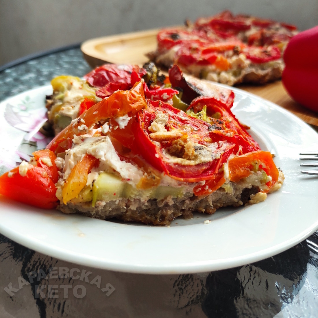 6. В форму для запекания выложить ровным слоем фарш, на него кружки кабачка. Посолить и поперчить. На кабачки кольца перца, на перец кругляшки помидор. посолить и все залить сметаной с яйцами.
