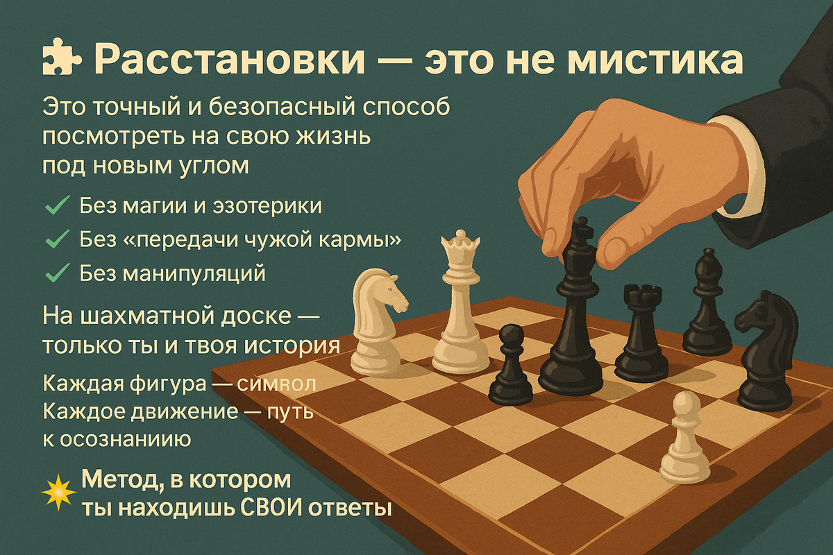Вместо заместителей — фигуры на доске. Вместо группы — только вы и расстановщик. Вместо театральной драмы — точное отражение внутренних системных процессов. 📌 Расстановки на шахматной доске — НЕ магия.