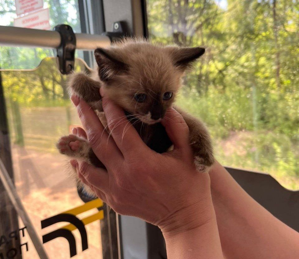 Водитель Мострансавто спас котенка🥳 Пассажирка рассказала, что когда она ехала на работу в автобусе, и они выезжали с поворота на главную дорогу, водитель Андрей Прокофьев (ПБ «Сергиев Посад», МАП №10 Королев) вдруг громко объявил, что заметил на обочине крошечного истощеного котенка. Он не проехал мимо, а остановил автобус. Женщина забрала малыша себе, откормила его и назвала Гав.