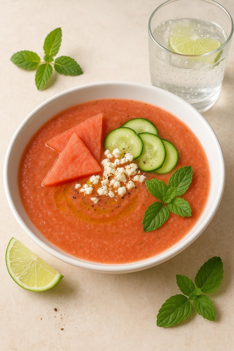 Хотите поразить друзей и удивить себя новым летним вкусом? Ультрабыстрый гаспачо из арбуза и огурца — это то, что нужно для жары, когда горячие плиты и сложные рецепты вообще не радуют. В гаспачо сладость арбуза встречается с хрустящей свежестью огурца, лаймом, мятой и пикантной ноткой перца😋 Суп получается невероятно освежающим, лёгким, буквально спасающим в летний полдень. Идеальный рецепт для тех, кто устал от рутины, хочет новых впечатлений от еды и ценит своё время: суп займет всего 10 минут и станет вашим личным лайфхаком на даче, пикнике или после тяжёлого дня. (на 4 порции) - Арбуз (без косточек) — 500 г - Огурец — 1 крупный (около 200 г) - Красный болгарский перец — ½ шт. - Мята — 10-12 листьев - Лайм или лимон — 1 шт. (и сок, и цедра) - Оливковое масло — 2 ст. л. - Соль, чёрный перец — по вкусу - Щепотка острого перца (по желанию) Для подачи: - Крошка феты или веганского сыра - Мелко нарезанный красный лук - Кунжутные семечки - Кубики льда 1