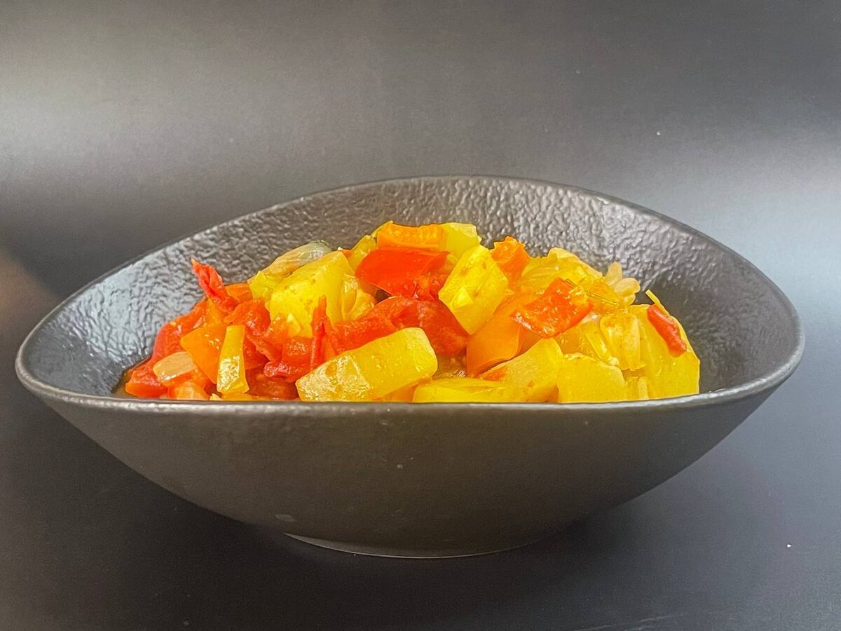 Поочерёдно режем кубиками овощи и добавляем их на сковороду.