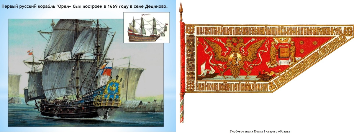 А вот обычай помещать названия судов на бортах в большинстве стран появился гораздо позже – лишь в XVII веке. Что касается России, этот обычай установился только к концу царствования Петра I, хотя и до него, случалось, давать названия некоторым судам. Так, первый боевой парусный корабль по велению отца Петра Алексея Михайловича получил название «Орёл». В указе по этому поводу говорилось: «Кораблю, который в селе Дединове сделан, прозвание дать «Орлом». Поставить на носу и корме по орлу и на знамёнах нашить орлы же». Установленные на корме и носу окрашенных под золото деревянные резные двуглавые орлы позже надолго стали традиционным украшением всех военных судов.
