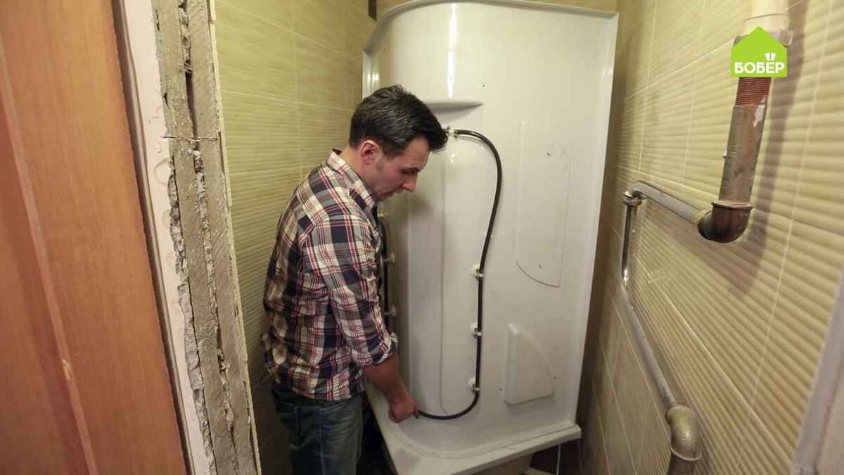 Если вы хотите серьёзно сэкономить на установке душевой кабины, сделайте это самостоятельно! Наш мастер расскажет, что нужно делать. Когда поддон собран и выставлен по уровню, пришло время установить саму душевую кабину, которую для удобства работы рекомендуется развернуть. В задней стенке и поддоне есть технологические отверстия, которые нужно совместить и стянуть болтами и гайками, находящимися в комплекте, при помощи гаечных ключей. Не усердствуйте при закручивании — это повредит кабину. Подобным образом закрепите болты по всему периметру конструкции. Разверните кабину и установите собранную заранее раму из профиля на поддон. Для удобства крепежа рамы слегка разверните кабину, совместите отверстия и закрутите шурупы, которые находятся в комплекте. Сделайте то же для всех отверстий. Установите крышу: забросьте её наверх и совместите технологические отверстия. Закрепите крышу так же, как заднюю стенку к поддону: болтами и гайками. Подключите душ: наживите шланг вручную и закрепите га