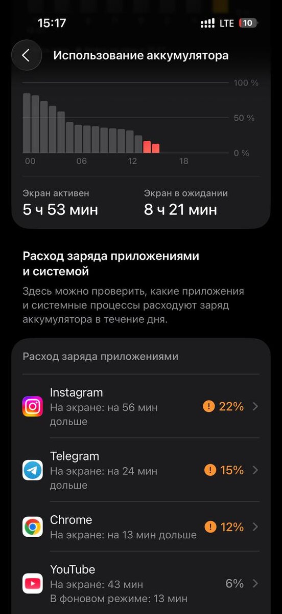 В ответ на пост ⚡️Автономность iOS 26 Public Beta 1/Beta 4 Снял с зарядки в 21:03 и активно пользовался до 04:00 утра, а потом с 12:00. В итоге в 15:17 оставалось 10%. По условиям все стандартно для меня: LTE на двух симках, вайфай/сотовая сеть 50/50 по времени. Яркость 50%. Как обычно соцсети, браузер, ютуб, навигация. Айфон 16 Про, емкость аккума 98%. Always On и 120гц включены. В итоге чуть не довел тест до конца, так как надо было ставить на зарядку, но получается прям почти идентично прошлой сборке 4 беты. В итоге бы вышло все те же 6,5 часов. Как у вас?🤔