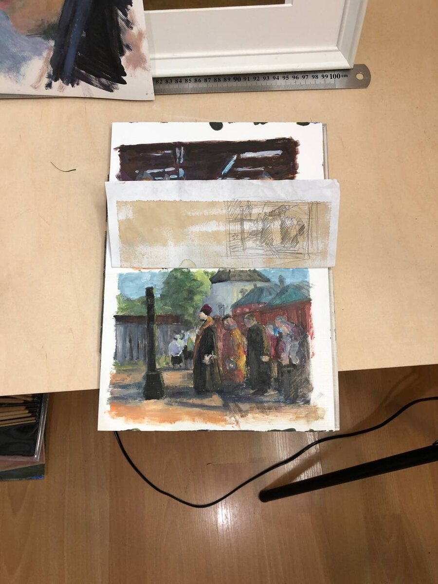 Во-первых, есть ощущение, что я надышалась тройником. (Хоть сидела при открытой балконной двери). Во-вторых, боюсь, быть маслянистом - это очень смелое решение для меня. С этим пробником а5-го формата я провозилась два часа. Под конец напрочь запуталась где какие кисти и все стало приходить одному среднему грязному тону 😂😂 Заканчивала уже вообще одной кистью. 🙈 Потому что чего уже волноваться:))) Этот сюжет вынашивала больше года и продумывала его для пастели. А сегодня решила, что пастелью надо брать очень большой формат, а времени нет. А маслом - навыков нет 😂 Ладно, врагу не сдается наш гордый варяг. Если честно, у меня уже вообще нет особой мотивации торопиться к выставке (этот сюжет я хотела именно к Балашихе в лицах). Потому что как куратор, вижу сколько и какие прекрасные работы присылают в заявках! Мне просто хочется разместить их, ибо переживаю, что всё не поместится! Выставка будет интересная! А мне надо все таки решить что делать - живопись или графику. Навер