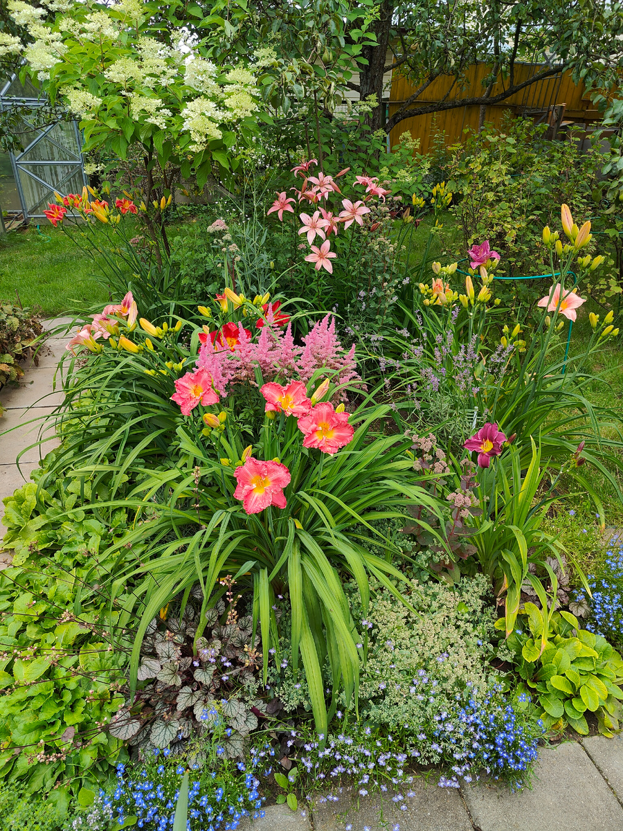 В этом году лилейники цветут как никогда. Не знаю, что на них так повлияло. Вероятнее всего, тёплая зима. Других предположений у меня нет. Больше никаких положительных моментов в этом сезоне не было. Больше всего лилейников у меня посажено в специально для них создававшийся три года назад цветник. Как раз тогда у меня был острый период любви к лилейникам. Почти все лилейники безымянные: они достались мне пересортом или по обмену с местными садоводами. На заднем плане цветника растут два огромных куста с очень высокими цветоносами. Они разрастаются как бешеные. В прошлом году вообще не цвели. Не то, что скудно, нет - вообще ни одного цветочка не было. Я подумала, что именно из-за северного характера этого сорта мне его и отдали - он цветёт через год. Решила дать ему последний шанс в текущем сезоне. И он послушался. Рядом с ним растёт похожий по цвету, но с намного более крупными цветками сорт с покладистым характером. Цветёт всегда стабильно. Цветки темно-красные, широко раскрытые. По к