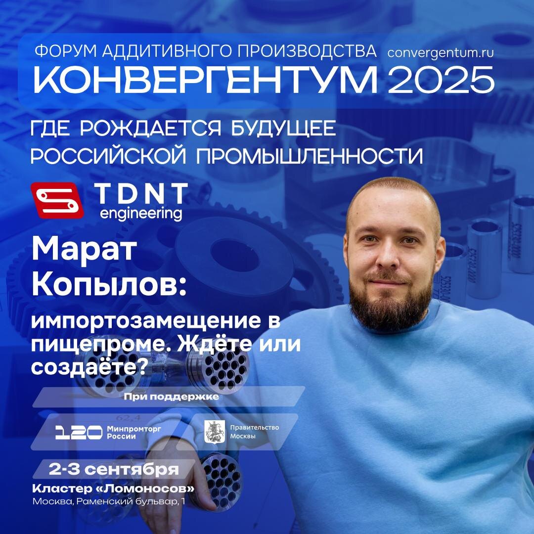 Марат Копылов: импортозамещение в пищепроме. Ждёте или создаёте? Если вам нужны не теории, а готовые решения для замены импортных комплектующих в пищевой промышленности — ваш ориентир на «Конвергентум 2025» — выступление Марата Копылова (ООО «ТДНТ ИНЖИНИРИНГ»). Почему это важно? С 2022 года команда Марата решает проблему дефицита запчастей без господдержки, используя: ➕ Гибрид 3D-печати с классической обработкой (фрезеровка, токарные работы) ➕ Реальные кейсы: сокращение сроков с 6 месяцев до 3 недель и снижение стоимости в 2–3 раза Что вы узнаете на форуме: ✅ Почему аддитивные технологии — не волшебная таблетка, а часть инженерного комплекса ✅ Как адаптировать оборудование под конкретные задачи пищепрома ✅ Почему импортозамещение может быть быстрым и выгодным уже сегодня «Настоящие технологии рождаются на производстве, где решают невыполнимые задачи. Наш опыт — это люди и результат» (М. Копылов) Хотите такие же решения? Приходите на «Конвергентум 2025» — получите практические инса