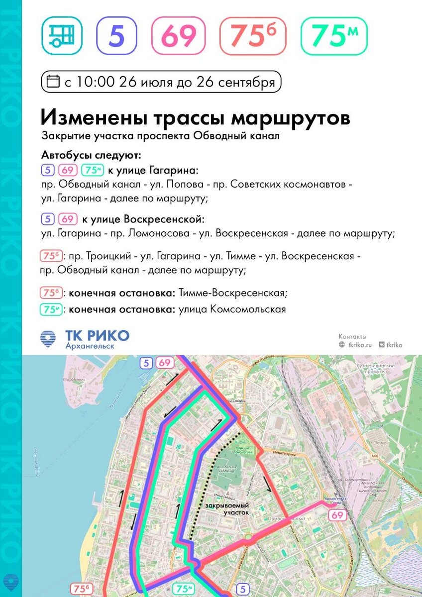 ⛔️ В связи с ремонтом участка теплотрассы полностью перекрывается для движения автотранспорта просп. Обводный канал на участке между улицами Садовая и Логинова ⠀ 🛟 с 10:00 25 июля до 24:00 26 сентября 2025 года ⠀ 🚌🚌 Движение автобуса №75Б будет организовано следующим образом: проспект Троицкий - ул. Гагарина - ул. Тимме Я. - ул. Воскресенская - просп. Обводный канал и далее по схеме маршрута. ⠀ ❗️ В период изменения схем движения из маршрутов исключаются остановочные пункты: Улица Комсомольская Улица Гайдара Улица Логинова Улица Воскресенская_ на просп. Обводный канал ⠀ ❕ В состав маршрутов включаются остановочные пункты: ⠀ 🔹Швейная фабрика 🔹Тимме-Воскресенская на ул. Тимме 🔹Тимме-Воскресенская 🔹АГКЦ 🔹Площадь Дружбы народов 🔹Проспект Обводный канал на ул. Воскресенской. ⠀ ❗️ №75Б - конечной остановкой будет остановочный пункт Тимме-Воскресенская на ул. Воскресенской. ⠀ 🚌🚌 Схема маршрутов №5, 69, 75М ⠀ ↪️ при движении в направлении ул. Гагарина: просп. Обводный канал - ул.