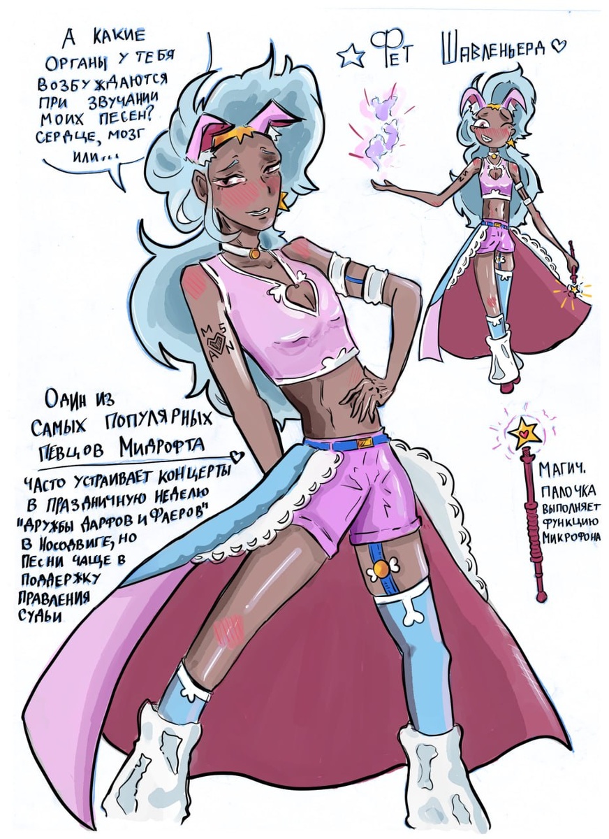 БАБААААААААХ Чтож, если работа с комиксом по ТА застопилась, то это не значит, что я не могу развивать лор Мидрофта и делиться с вами. Я ХОЧУ ДЕЛИТЬСЯ! Но, чтобы не спойлерить сюжетку, буду рассказывать вам изредка о третьестипенных персонажах и всяких местах/событиях мирка по авантюристам Так вот, этого персонажа зовут Фет. Он певец, который раньше скитался по миру с песнями о своей жизни, приключениях и своём народе, но как-то ужился в Носодвиге при правлении Верховного Судьи. Сейчас он в основном выполняет функцию этакого пропагандиста режима Судьи в Носодвиге. Так же Фет играет в театре. Фокс кстати его скрытый фанат... Ну, не потому что Фет женственный, а потому что поддерживает Судью. А ваши мысли куда уже полезть успели шалунишки?))) Ладно, доброй ночи всем, я сегодня чета допоздна рисовал