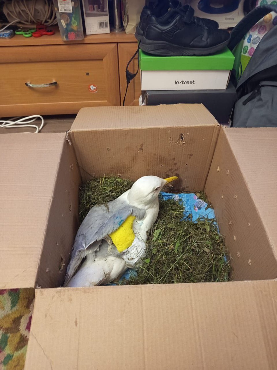 Чайка со сломанным крылом, которую сегодня весь день ловила и спасала девушка Наталья, поймана! Наталья отвезла птичку к ветеринару, крыло запущено, некроз, необходимо удаление, открытый перелом. Во вторник операция по удалению. Поступок Натальи вызывает уважение, девушка не побоялась взять на себя ответственность за птичку, забрала ее домой, где живут кошки и собаки, в крохотную малосемейку.