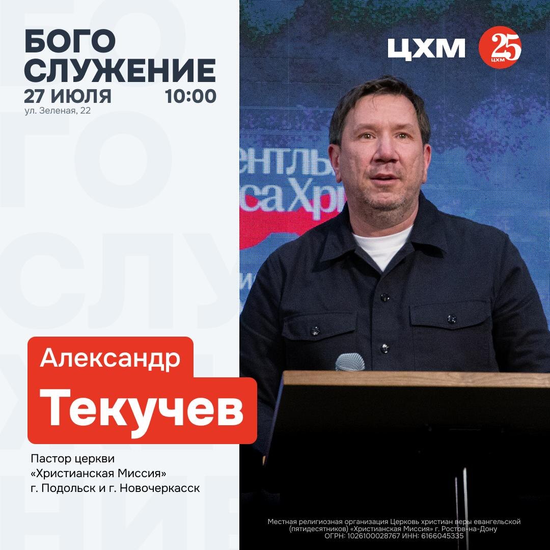 ДОРОГАЯ ЦЕРКОВЬ, ОЖИДАЕМ ВАС НА ВОСКРЕСНОМ БОГОСЛУЖЕНИИ 🤍 27 июля в 10:00 ⛪️ Словом будет делиться Александр Текучев пастор церкви "Христианская Миссия" г. Подольск и г. Новочеркаск Мы верим в силу совместной молитвы! Приглашаем всех желающих присоединиться к общей молитве в 9:30, чтобы вместе настроить наши сердца на встречу с Господом. «Шесть дней ешь пресный хлеб, а на седьмой день проведи собрание Господу, твоему Богу, и не делай никакой работы.» Второзаконие 16:8 НРП Мы с нетерпением ждем вас, чтобы вместе прославить нашего Спасителя и принять Его благословение! Адрес: Зеленая, 22 🖥 ВКонтакте «Цхм Ростов», трансляция служения — https://vk.com/cxm.rostov 🖥 РУТУБ «Цхм Ростов» трансляция служения — https://rutube.ru/channel/39499224/ 🖥️ YouTube «Цхм Ростов». Трансляция служения - https://youtube.com/@cxmrostov?si=gSKP3_oMbfVza0gg