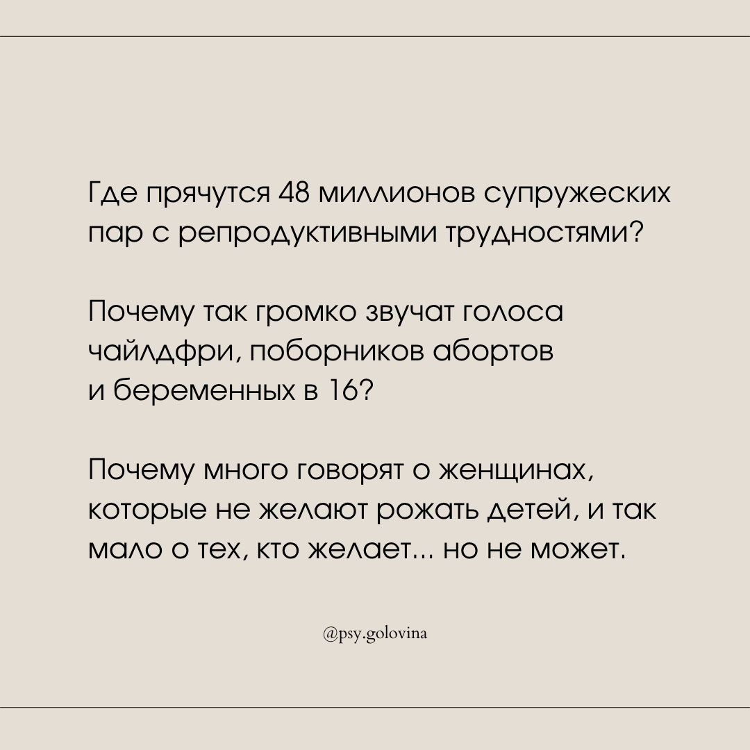 Есть люди, у которых нет детей. Наверное, они их не хотят. Или что-то не получается. На самом деле мне все равно, у меня свои дела. Мы все размышляем подобным образом ровно до того момента, пока беда не затронет нас лично. Пока она не станет центром нашей Вселенной. А до тех пор... Я поняла это, ежедневно встречаясь с такими женщинами в своем кабинете. Им просто не с кем обсудить происходящее. А может даже страшно про это рассказывать. Их либо не поймут, либо обвинят, что они делают что-то неправильно (не так сексом занимаются, не к тем врачам ходят, ситуацию никак не отпустят), либо начнут давать непрошенные советы. А от этого чувство своей никчемности и неполноценности только ширится в масштабах. "Я не могу забеременеть. Не могу реализовать такую простую функцию, свое предназначение. Да что же я за женщина такая!". К сожалению, многие утопают в самообвинениях и одиночестве, без поддержки и принятия со стороны. А еще они не замечают, что их состояние может стать как преградой, так и п