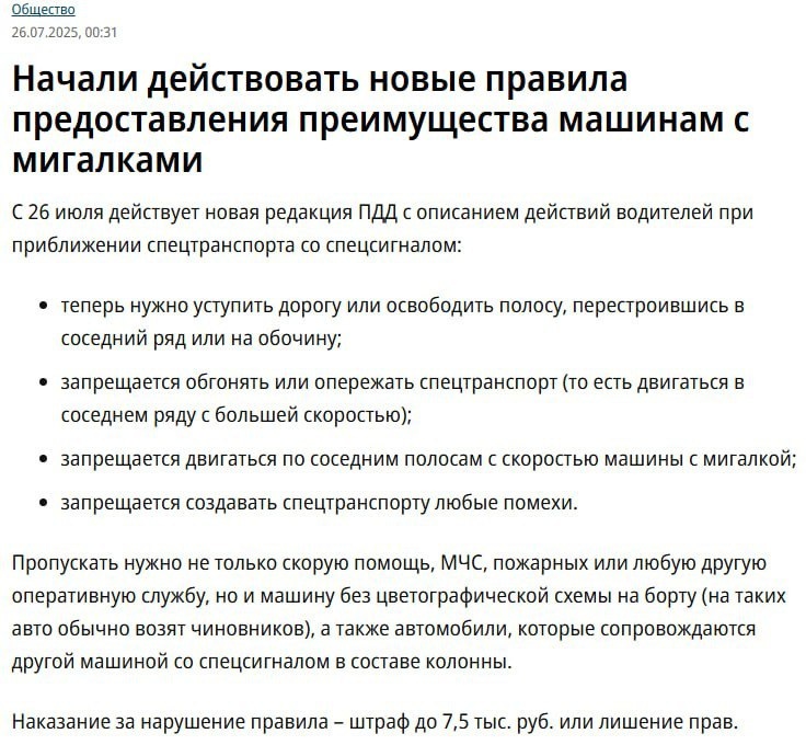 С 26 июля правила для водителей ужесточаются: теперь при виде кортежа или авто с мигалкой мало просто уступить — полосу придётся освободить полностью, иногда даже отправиться на обочину. По новым требованиям ехать рядом или обгонять такие машины строго запрещено. Особое новшество — уступать надо не только явным служебным авто, но и незаметным машинам, если там едут VIP-персоны. Нарушителям грозит штраф до 7500 рублей. А если забыли — последствия могут быть куда серьёзнее.