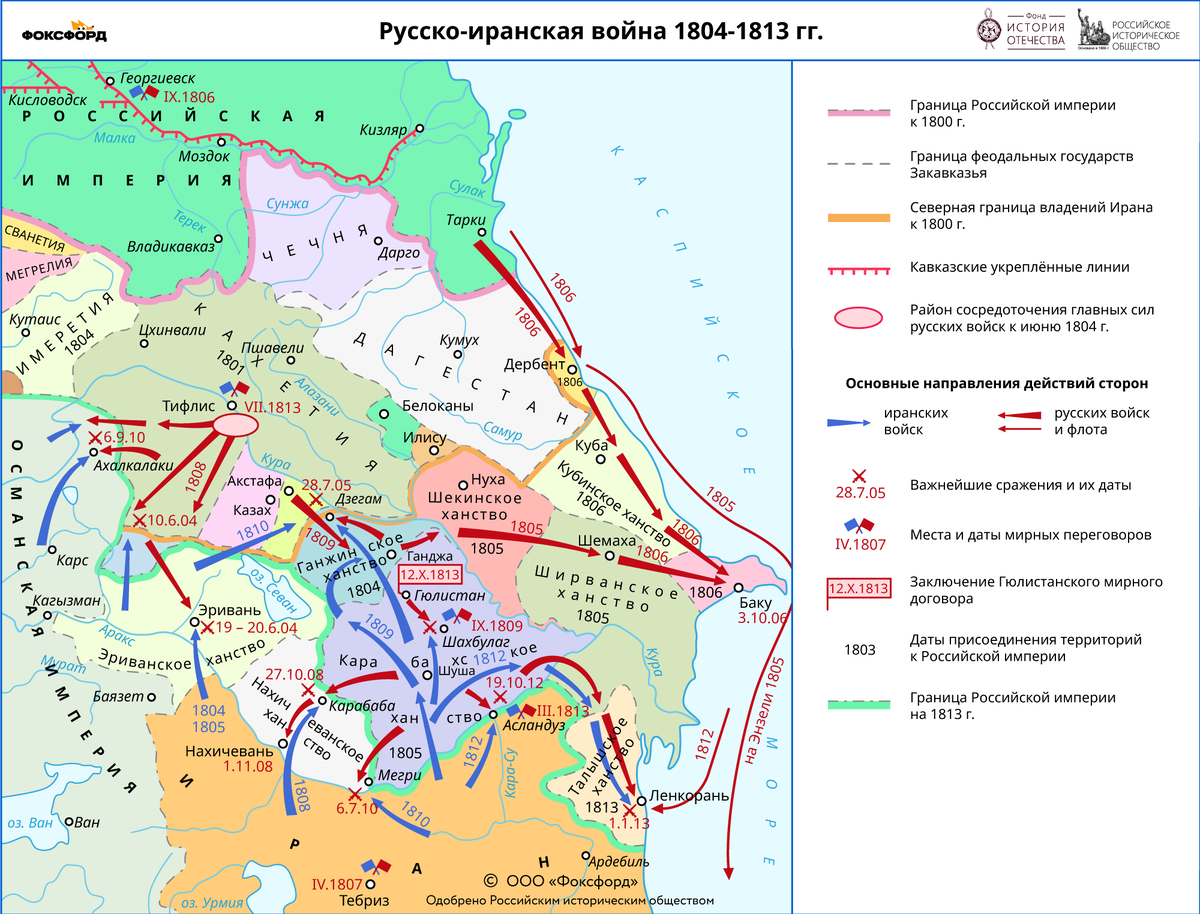 Когда в 1801 году Россия окончательно присоединила Восточную Грузию (в России в это время правил уже Александр I, внук Екатерины), терпение Персии лопнуло. Началась долгая и тяжелая Русско-персидская война. Русские войска под командованием решительного генерала Павла Цицианова (к сожалению, его фамилию никто, кроме историков и не вспомнит) двинулись на юг. Они взяли сильную крепость Гянджу (1804), а затем начали брать под контроль одно ханство за другим: Карабах, Шеки, Ширван. Ключевым был Баку, богатый порт на Каспии. Его осада закончилась трагически – генерал Цицианов был вероломно убит во время переговоров (1806). Но, несмотря на это, Баку всё же был взят. Война шла с переменным успехом почти десять лет, пока истощенная Персия не запросила мира.