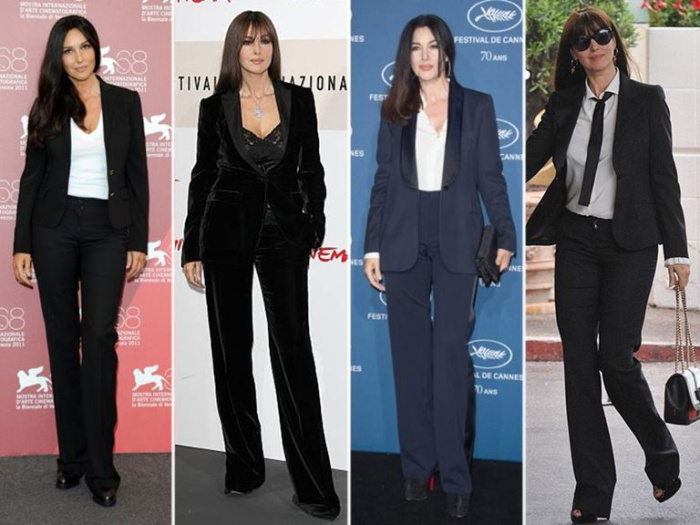 Моника Беллучи часто использует в своих образах мужской костюм. Это модный стилистический прием. Она обладает очень женственной внешностью. А на контрасте с мужским костюмом выглядит еще женственнее. Она итальянка. А у каждой итальянки чувство стиля в крови. И чувство моды тоже. А еще Италия - это страна, где иделизируются и возносятся в культ мода, тренды и стиль. Италия - это страна, где почитаются и вечные эстетические ценности- такие как раритеты искусства. Вся Италия наполнена архитектурными шедеврами. скульптурами, картинами. Все эти старинные твещи имеют высокую художественную ценность. Внешность Моники - это шедевр. Но она не чистая итальянка. Она имеет и ближневосточную кровь. Но итальянские гены на столько сильные, что перебивают во внешности все инородное. Костю такой - это очень эффектный прием. Он позволяет акцентировать внимание и будоражит воображение Прекрасный прем. позволяющий подчеркнуть красоту. Подчеркнуть уникальность Прекрасный прием. Прекрасные образы. Прекрас